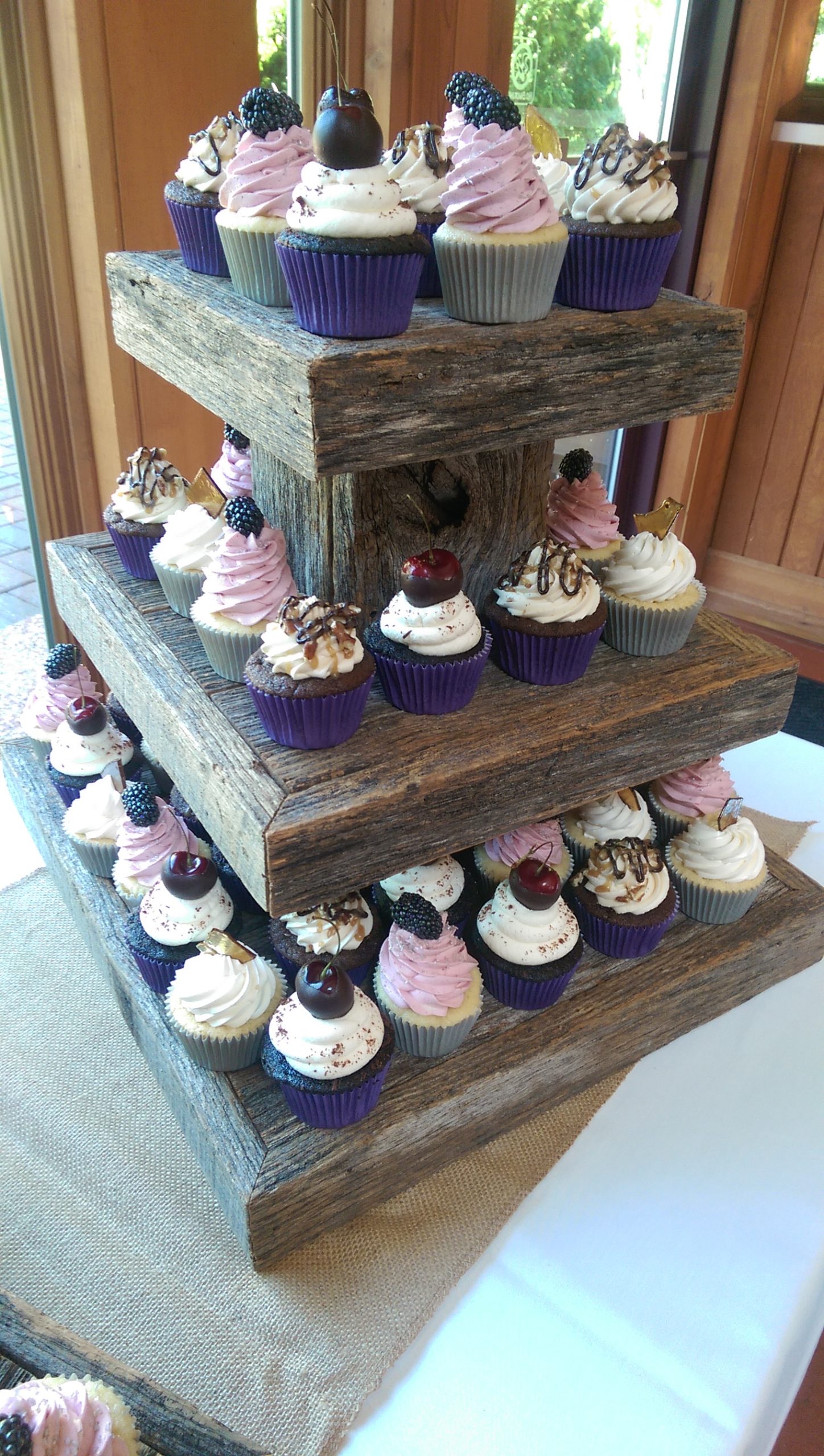 In my Pinterest perusing I saw a beautiful barn wood cupcake tower a couple had made for their wedding. I immediately fell in love and needed to make something similar. A short while after I fell in love with the tower, Jessica asked me to make the cupcakes for her reception. She showed me the invitation when I asked what theme or colors she was going with. The invite was beautiful with a silver wood grain background. I figured this was a perfect time to see if she would like the barn wood tower as much as I did. She did.