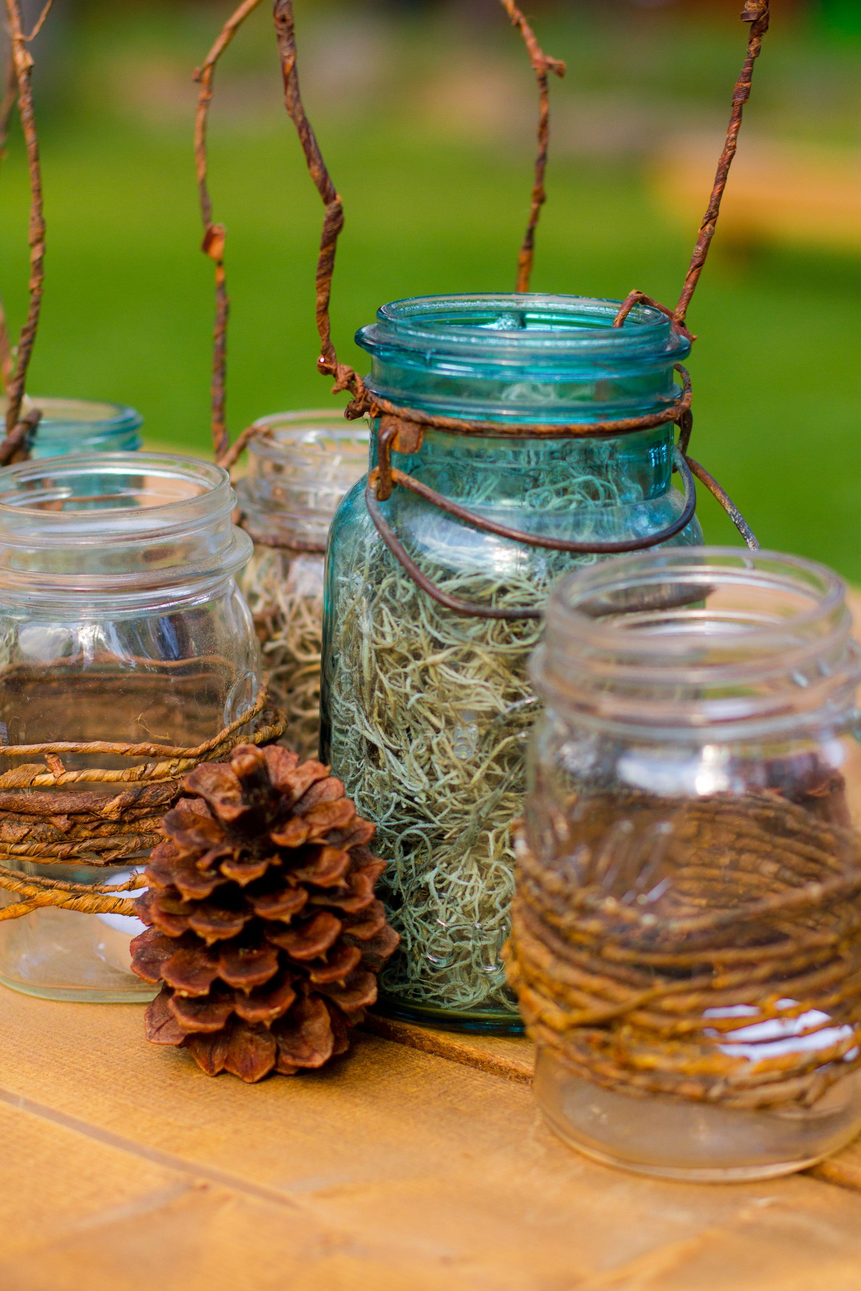 I raided my parent’s basement for an assortment of Ball jars. Added some barked twine for handles, lights and moss. Voila. Centerpieces. We borrowed the pine cones from Mother Nature. The tables and benches were rented from a local company.