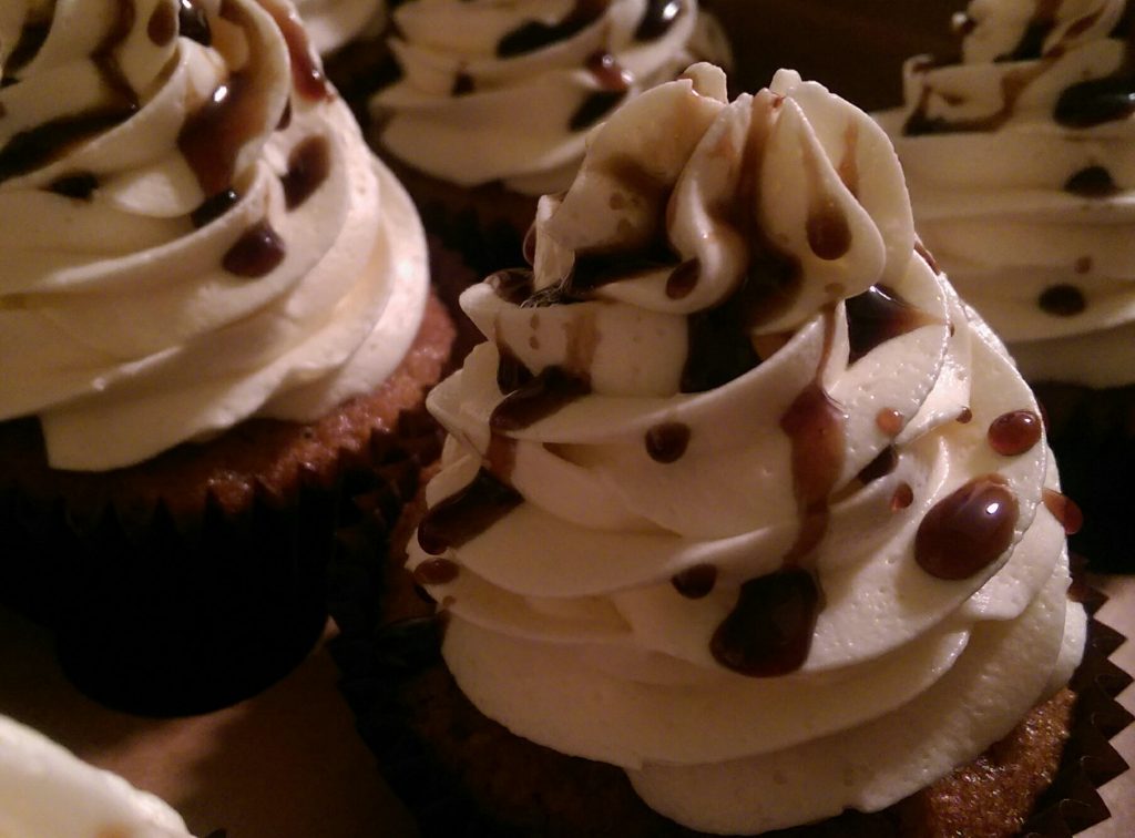 Sunday came and it snowed. All day. I did get quite a bit accomplished. Like two pans of venison lasagna for the freezer. I also got to try out a cupcake idea I had floating around my head for some time. I had purchased a bottle of root beer concentrate at the store awhile ago and then kind of forgot about it. I happened to have one bottle of Not Your Father’s Root Beer in the fridge. If you haven’t tried this stuff yet, go do it now. If you like root beer, this stuff is right up your alley. And let me tell you – add some vanilla ice cream for an “adult” root beer float and you will think you’ve died and gone to heaven. My idea was a root beer cupcake with a creamy ice cream like frosting. I had some cute little bottles of Rumchata in my possession as well. Another one of those, throw it in the cart for a rainy (snowy, in my case) day purchases. I’ve made Ermine Frosting or Boiled Milk Frosting for these but I wanted another layer of flavor. So instead of all milk, I used half milk and half Rumchata. Worked like a charm. I always love it when a plan comes together. I topped them with a root beer reduction which I kept eating so I’m surprised there was enough left to drizzle on the cupcakes.